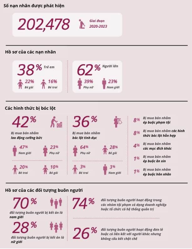 Gia tăng về số lượng và thay đổi về đối tượng nạn nhân. Trên phạm vi toàn cầu, nạn mua bán người đang không ngừng gia tăng cả về quy mô lẫn mức độ tinh vi. Sau thời gian giảm nhẹ trong đại dịch, số nạn nhân được phát hiện đã tăng trở lại một cách rõ rệt. Năm 2022, phụ nữ và trẻ em gái chiếm tới 61% tổng số nạn nhân bị phát hiện, trong đó đáng báo động là số lượng trẻ em gái bị mua bán đã tăng 38% chỉ trong vòng ba năm. Trẻ em đang chiếm tỷ lệ ngày càng cao trong tổng số nạn nhân, đặc biệt ở các khu vực chịu ảnh hưởng bởi xung đột và di dời dân cư.5