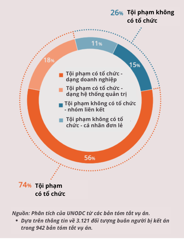 Sự tham gia của các tổ chức tội phạm có tổ chức. Ngày càng có nhiều vụ mua bán người do các đường dây tội phạm có tổ chức thực hiện. Những mạng lưới này hoạt động xuyên quốc gia, tận dụng công nghệ và khai thác các kẽ hở pháp luật để tránh bị phát hiện và truy cứu trách nhiệm hình sự. Năm 2022, có tới 74% các đối tượng phạm tội mua bán người hoạt động trong các nhóm tội phạm có cấu trúc chặt chẽ như doanh nghiệp hoặc tổ chức quyền lực, chỉ có 26% là các cá nhân hành động đơn lẻ hoặc hoạt động rời rạc, không có tổ chức rõ ràng.