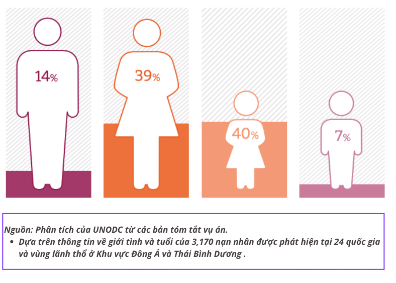 Trong giai đoạn từ 2011 đến 2020, có 7.356 nạn nhân của nạn mua bán người được các cơ quan chức năng giải cứu, trong đó 90% là phụ nữ và trẻ em. Phần lớn nạn nhân này đến từ những vùng nông thôn khó khăn, vùng sâu vùng xa, và hơn 80% là người dân tộc thiểu số với trình độ học vấn hạn chế.23 Những năm gần đây, tuy phụ nữ và trẻ em vẫn chiếm đa số trong số các nạn nhân bị mua bán, số lượng nạn nhân nam giới đã tăng lên đáng kể. Riêng trong năm 2022, hơn 50 nạn nhân nam – bao gồm cả người lớn và trẻ em – đã được giải cứu khỏi các hình thức bóc lột tại Campuchia, và 92 người khác bị bóc lột trên đường phố Hà Nội đã được Tổ chức trẻ em Rồng Xanh hỗ trợ.