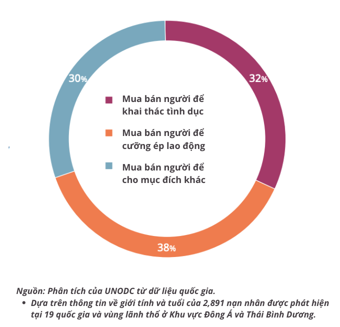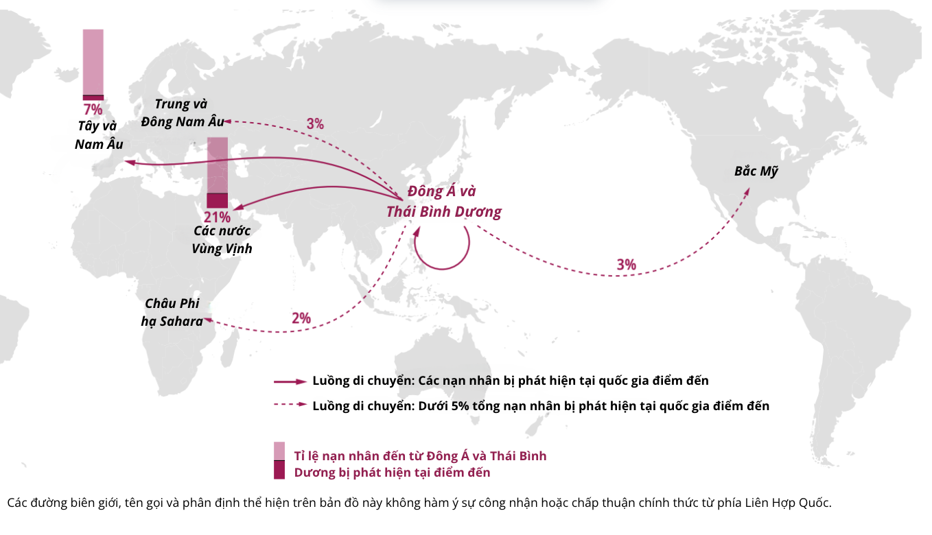 Khu vực Đông Á và Thái Bình Dương6 chiếm một tỷ lệ đáng kể trong tổng số các vụ mua bán người trên toàn cầu. Khác với nhiều khu vực khác – nơi mà phụ nữ trưởng thành chiếm phần lớn nạn nhân được phát hiện – tại khu vực này, cơ cấu nạn nhân đa dạng hơn, với tỷ lệ nam giới và trẻ em bị mua bán cũng ở mức đáng kể.